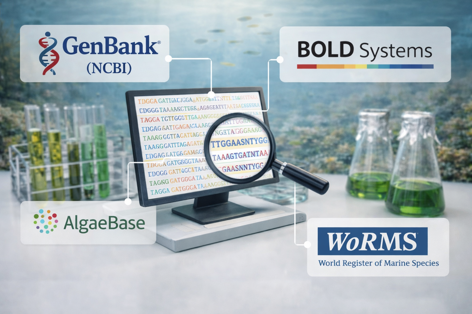 Además de las bases mencionadas, se utilizan diversas herramientas complementarias: BLAST (buscador de similitudes de secuencias de NCBI), programas de edición/filtrado (p.ej. Geneious, MEGA) y pipelines de eDNA (QIIME, OBITools) para procesar datos de secuenciación masiva. El curso incluye formación práctica en ellas. Sitios oficiales de consulta: GenBank (NCBI), BOLD Systems, AlgaeBase, WoRMS, junto con bibliotecas de marcadores estándar (rbcL, tufA, cox1, ITS) en línea.